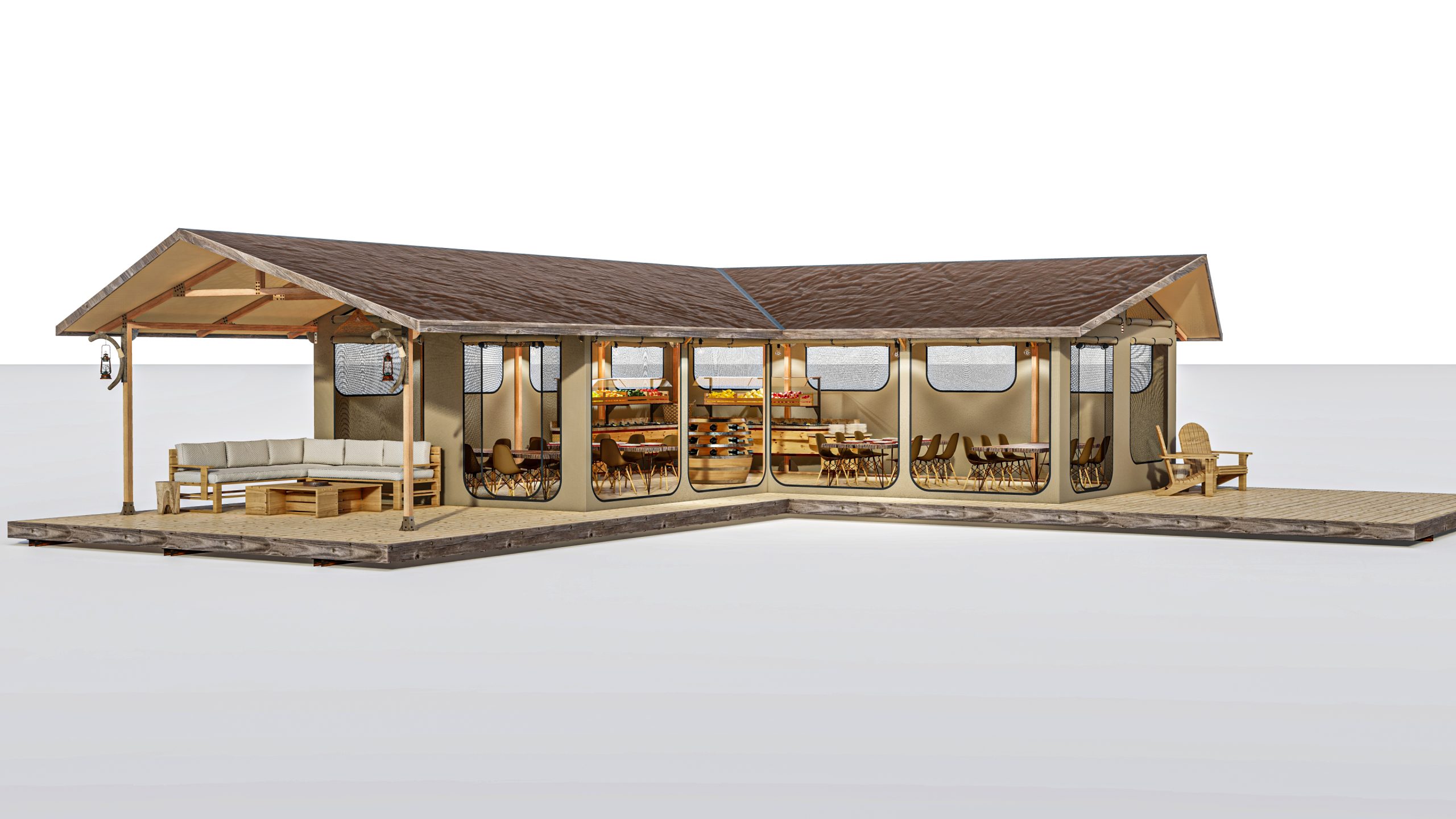 The roofing panels are built with solid coated steel, insulated with rock wool. All Lodge Tent types are modular and extendable in length without additional customisation charges. The canvas walling system is easy to handle and panels can be replaced without the need for a Tentickle installation crew.